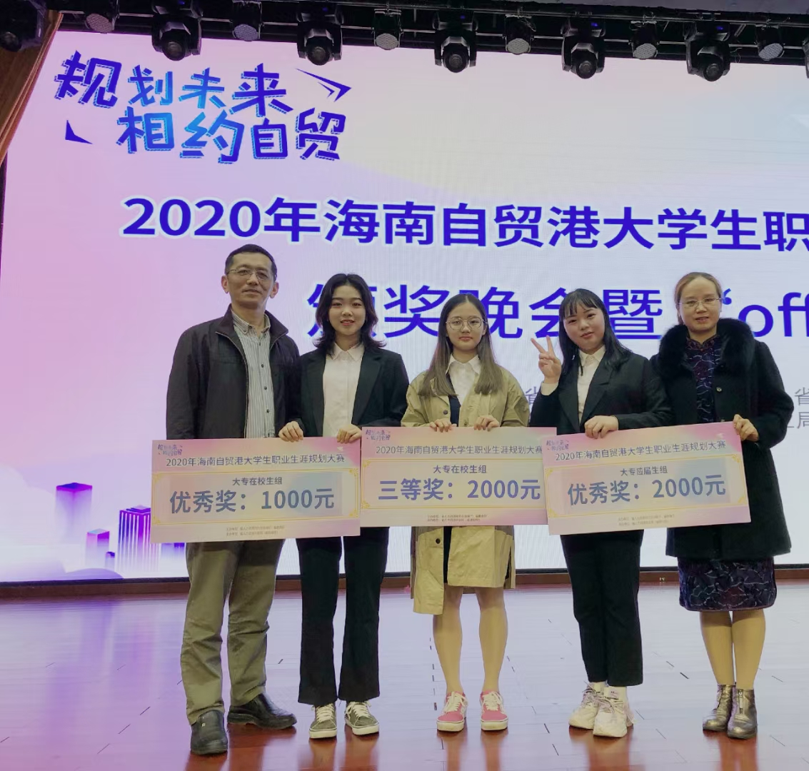 ↑2020届毕业生刘丹同学(右二)荣获海南自贸港老员工职业生涯规划大赛优秀奖